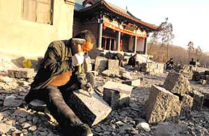 Một người thợ đang bận rộn làm việc tại chùa Đông Lâm