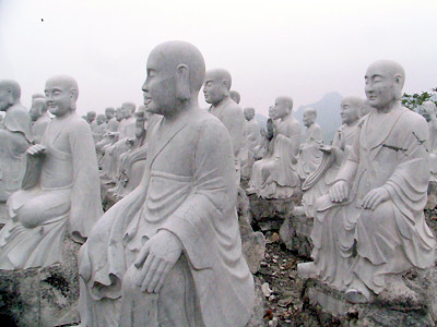Điều còn khiến chúng tôi bất ngờ hơn là khu vực đang tập kết tượng La Hán trên mỏm đồi ở phía trước Tam Thế điện. Tất cả có khoảng 200 pho tượng đá trắng nguyên khối, mỗi pho cao quá đầu người (2,3m), đặt thành hàng lối như một “rừng tượng”. Mỗi pho đều được đánh số theo thứ tự.