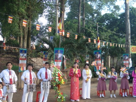 Buổi lễ đã được cử hành trang nghiêm theo lễ nghi truyền thống Phật giáo: Chào quốc kì, Phật kì, tuyên đọc thông điệp của đức Pháp chủ, diễn văn của hoà thượng chủ tịch hội đồng trị sự trung ương GHPGVN, tụng bài sám Khánh đản, nghi thức tắm Phật và thả chim bồ câu cầu nguyện hoà bình… Nhân dịp này nhóm Phật tử từ thiện bồ câu trắng cùng diễn viên đện ảnh Việt Trinh đã đến tham dự đại lễ và tặng 200 phần quà cho các em học sinh nghèo hiếu học ở địa phương.