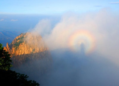 Một hình người xung quanh có vầng hào quang tỏa sáng xuất hiện trên núi Zushan, sau một trận mưa lớn ở Tần Hoàng Đảo, tỉnh Hà Bắc (Trung Quốc). Nhiều khách du lịch cho đây chính là hiện thân của đức Phật.
