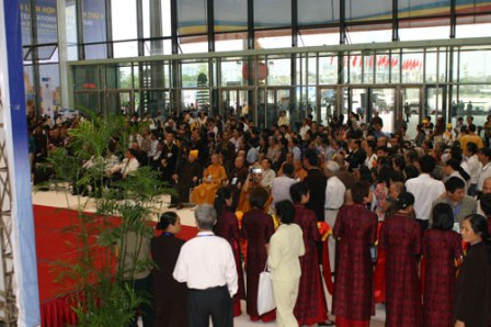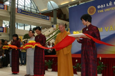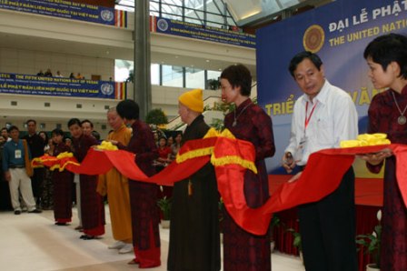 Đến tham dự và chứng minh cho buổi lễ có Hòa thượng Thích Thanh Tứ – Phó chủ tịch Thường trực HĐTS Giáo hội Phật giáo Việt Nam, Hòa thượng Thích Trí Quảng – Phó Chủ tịch HĐTS Giáo hội Phật giáo Việt Nam, Phó trưởng Ban điều phối Quốc gia; GS.TS Lê Mạnh Thát – Chủ tịch IOC; ông Đỗ Quý Doãn – Thứ Trưởng Bộ Thông tin và Truyền thông; ông Nguyễn Hữu Doanh – Phó Ban Thường trực Tôn giáo Chính phủ cùng các Chư Tôn đức, đại diện nhiều ban ngành và các cơ quan báo chí trong cả nước. Triển lãm văn hóa nghệ thuật Phật giáo bao gồm 3 mảng chính: Nhiếp ảnh Phật giáo, Mỹ thuật Phật giáo và Cổ vật Phật giáo . Phần nhiếp ảnh được trưng bày bởi 108 bức ảnh của nhiếp ảnh gia Võ Văn Tường – đây là những tác phẩm đặc sắc về kỷ lục Phật giáo của ông về Phật giáo trong suốt thời gian qua. “Cổ vật Phật giáo Việt Trước đó, cũng tại Trung tâm Hội quốc gia, Thứ trưởng Đỗ Quý Doãn cùng Chư tôn Giáo phẩm HĐTS TƯ GHPGVN và các thành viên IOC đã chủ trì lễ khai mạc Trung tâm Báo chí Đại lễ. Theo thông tin của Ban tổ chức Đại lễ, sẽ có gần 200 nhà báo trong và ngoài nước tác nghiệp mỗi ngày trong suốt thời gian diễn ra Đại lễ.