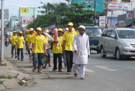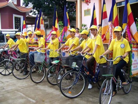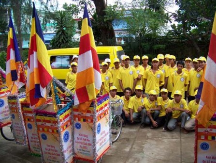 Song song với việc treo cờ, pano, biểu ngữ các tình nguyện viên còn làm các công tác tuyên truyền như phát tờ rơi, diễu hành xe hoa… để người dân thấy được tầm vóc to lớn của Đại lễ Phật đản năm nay.