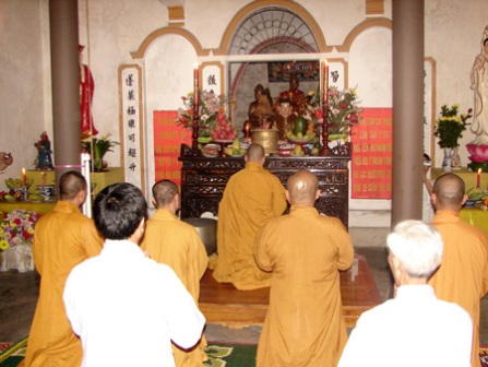 Chư tăng hành lễ trong chính điện của ngôi chùa nhỏ địa phương.