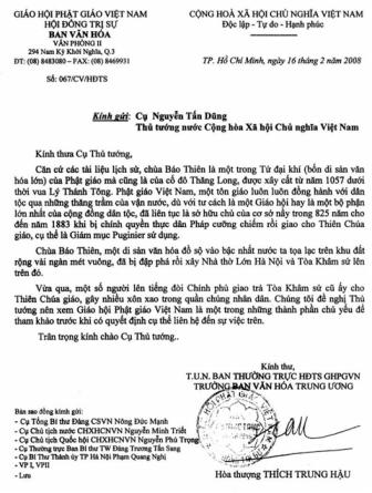 Vừa qua, một số người lên tiếng đòi Chính phủ giao trả Tòa Khâm sứ cũ ấy cho Thiên Chúa giáo, gây nhiều xôn xao trong quần chúng nhân dân. Chúng tôi đề nghị Thủ tướng nên xem Giáo hội Phật giáo Việt Nam là một trong những thành phần chủ yếu để tham khảo trước khi có quyết định cụ thể liên hệ đến sự việc trên.